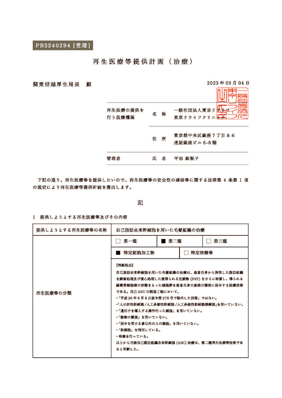 At Tokyo Relife Clinic, we provide stem cell therapy in full compliance with this Act. Our treatment protocols, cell handling procedures, and quality management systems have undergone rigorous regulatory review. We submit our Regenerative Medicine Treatment Plans to the appropriate authorities and have received official acceptance from the Ministry of Health, Labour and Welfare.