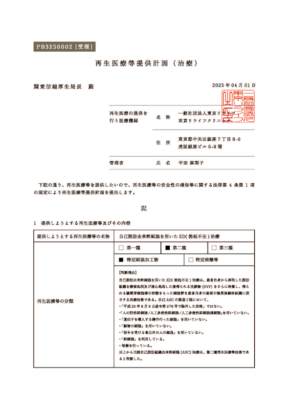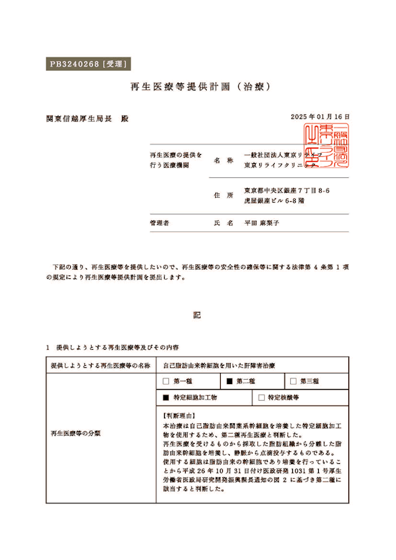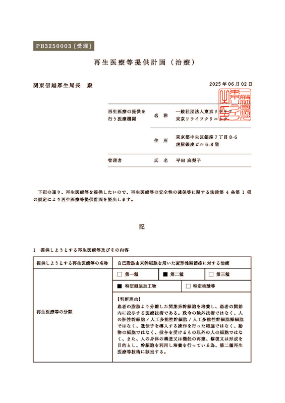 Currently, our clinic has obtained acceptance for nine (9) Type II Regenerative Medicine Treatment Plans.