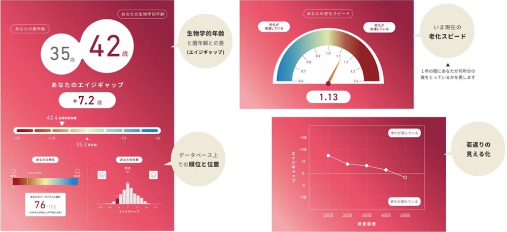 血液検査を通して、DNAの配列ではなくメチル化パターン(DNAのスイッチ状態やバランス)を解析し、現在の身体状態を示す生物学的年齢の指標を算出します。
