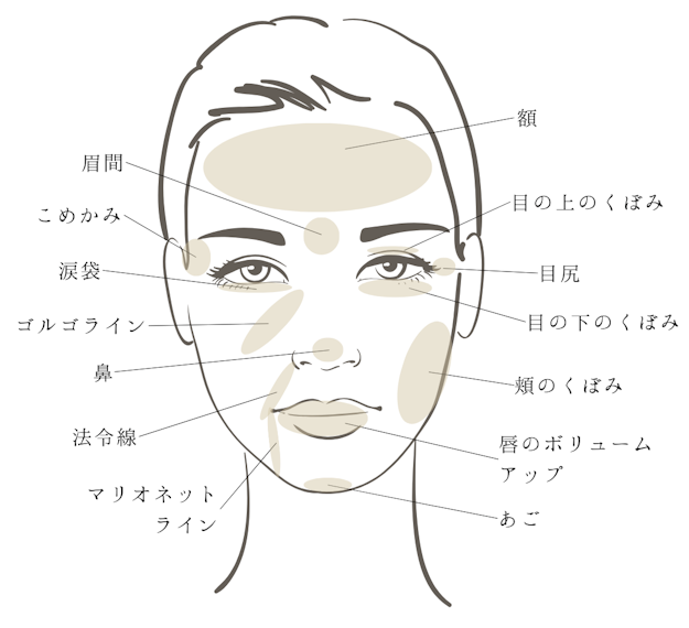 ※部位によってはヒアルロン酸注射ではなく、ボトックス注射の方が適用の場合もあります。詳細は診察にて医師の確認のもとお伝えします。
