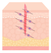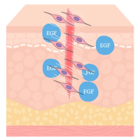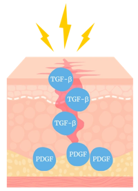 水光注射により真皮に無数の微小創傷が生じると、身体はそれを「創傷」と認識し、創傷治癒の過程で反応が起こります。この過程において、PRPに含まれるPDGFが中心的な役割を果たすと考えられています。