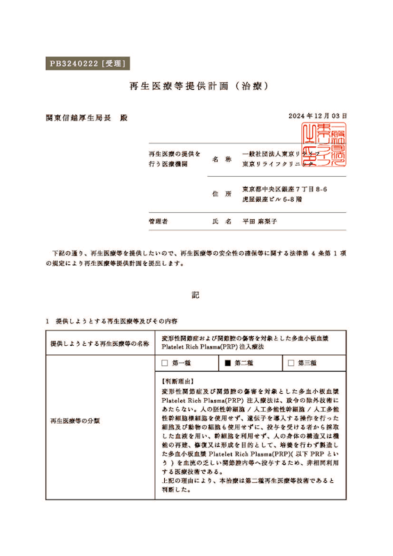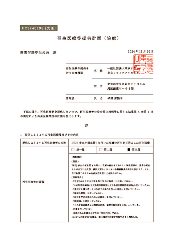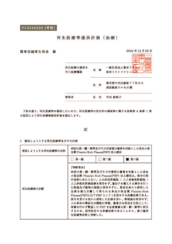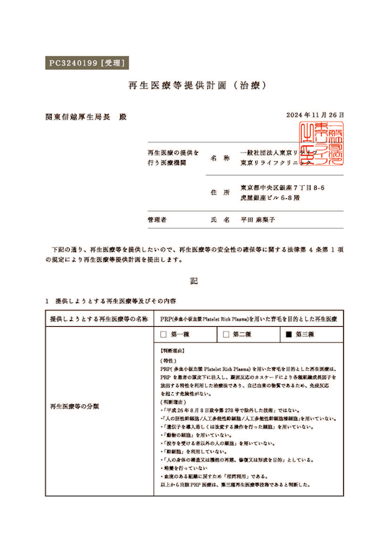 東京リライフクリニックでは、再生医療等安全性確保法(安確法)に基づき、厚生労働省より以下の治療科目を取得し、PRP治療を再生医療等提供計画に基づく治療として実施しています。